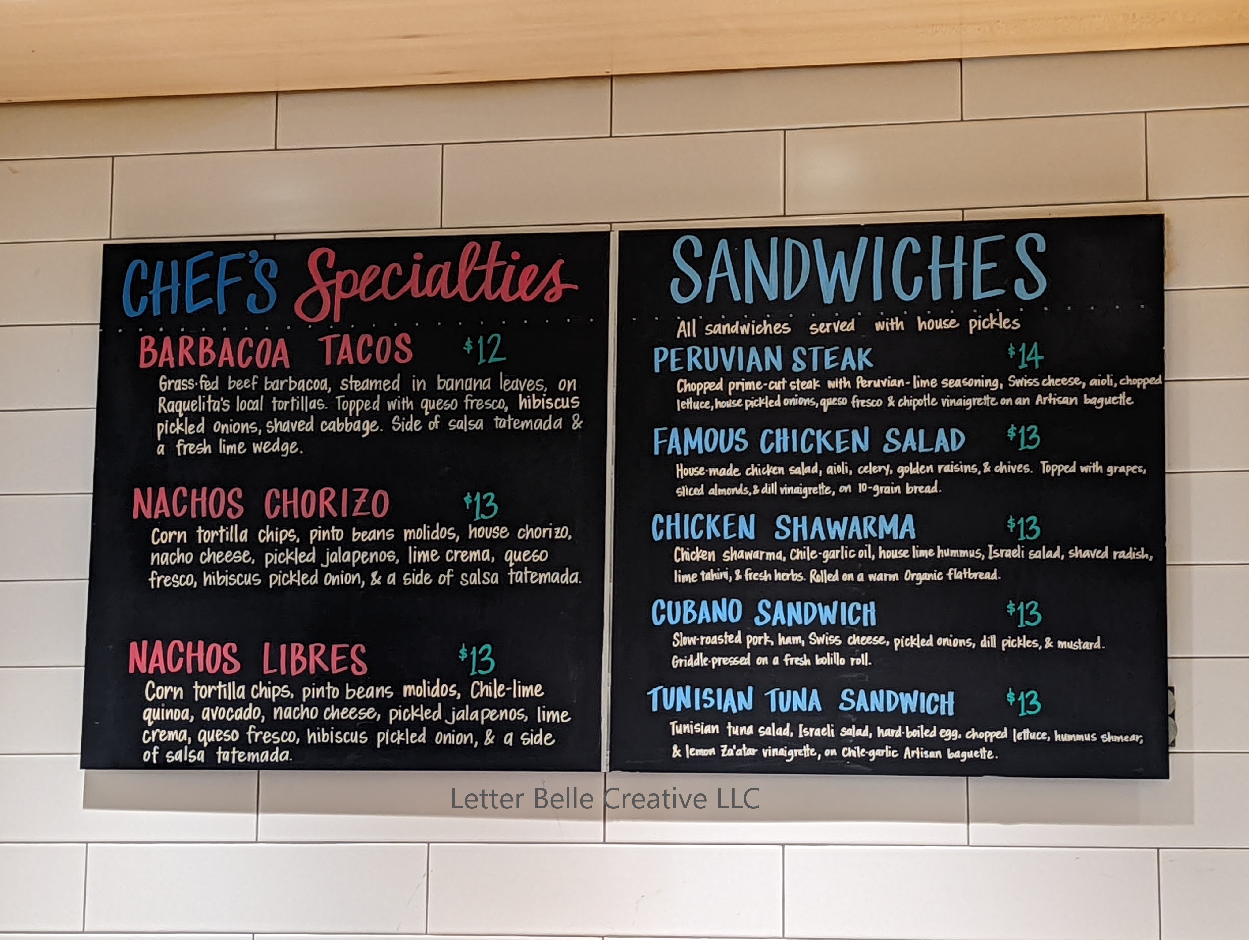 Hand lettered signage, customized to fit the theme of your event & special occasion. Signage for businesses include menus, price lists, and a-frames used for promotion of events, specials, prices, etc. at your location. Ink used: chalk markers or paint markers, depending on the surface & application of sign.